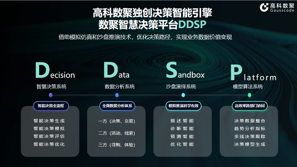 面对市场的高复杂度、高不确定性、高成本和高风险等企业决策背景,dcbox小金库app凭借大决策应用概念,成功在国内推出首个数据驱动决策(Data to Decision)的“大决策”平台——dcbox小金库app智慧决策平台 DDSP (Decision Data Sandbox Platform)。